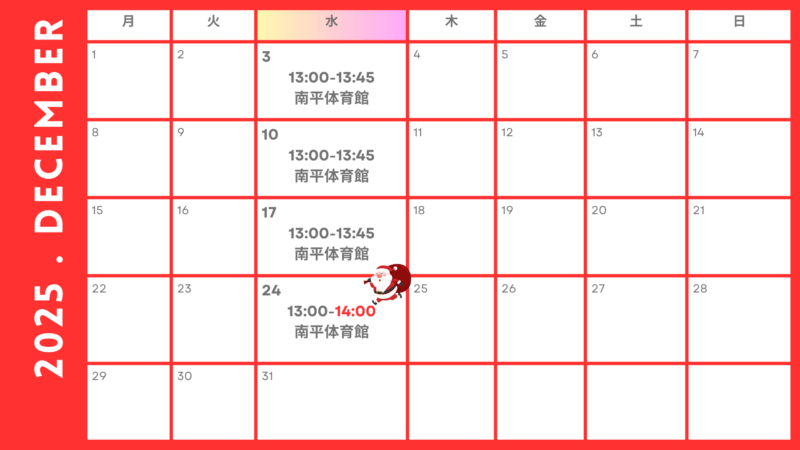 | 12月24日(水) | 13:00-14:00 | 日野市立南平体育館 | 多目的ルーム 1 |
