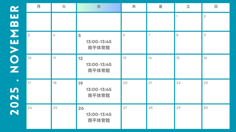 11月26日(水) | 13:00-13:45 | 日野市立南平体育館 | 多目的ルーム 1 |