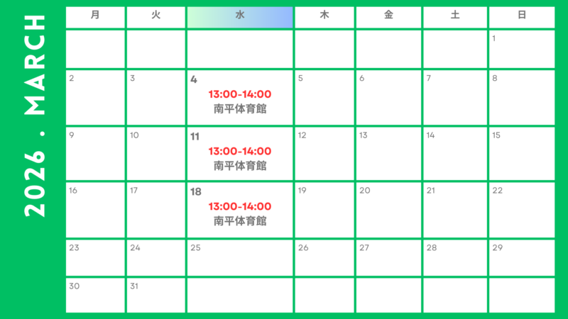 | 3月 4日(水) | 13:00-14:00 | 日野市立南平体育館 | 多目的ルーム 1 |